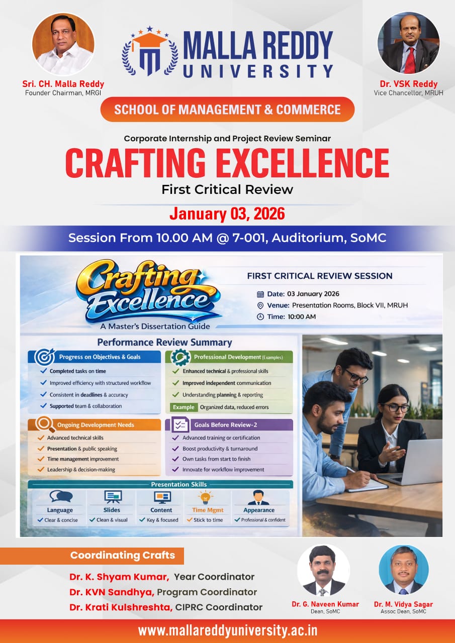 Crafting Excellence is the First Critical Review Seminar for Master's dissertation projects at Malla Reddy University, School of Management & Commerce.